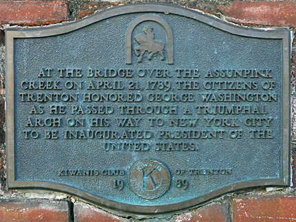 36. ^ The plaque at this site, which reads, "At the bridge over the Assunpink Creek on April 21, 1789, the citizens of Trenton honored George Washington as he passed through a triumphal arch on his way to New York City to be inaugurated President of the United States," was placed by by the Kiwanis Club of Trenton in 1989.