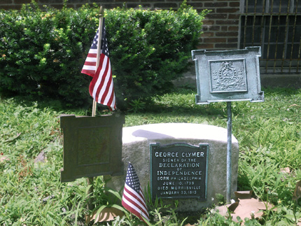 George Clymer (1739 - 1813), who signed both the Declaration of Independence and the United State Constitution for Pennsylvania, is buried in the cemetery. Clymer is one of only six men who signed both documents. (The other five were George Read, Roger Sherman, Benjamin Franklin, Robert Morris, and James Wilson.) Revolutionary War officers Major General Philemon Dickinson (1739 – 1809) and Colonel Lambert Cadwalader (1742 - 1823) are buried here as well. [22]